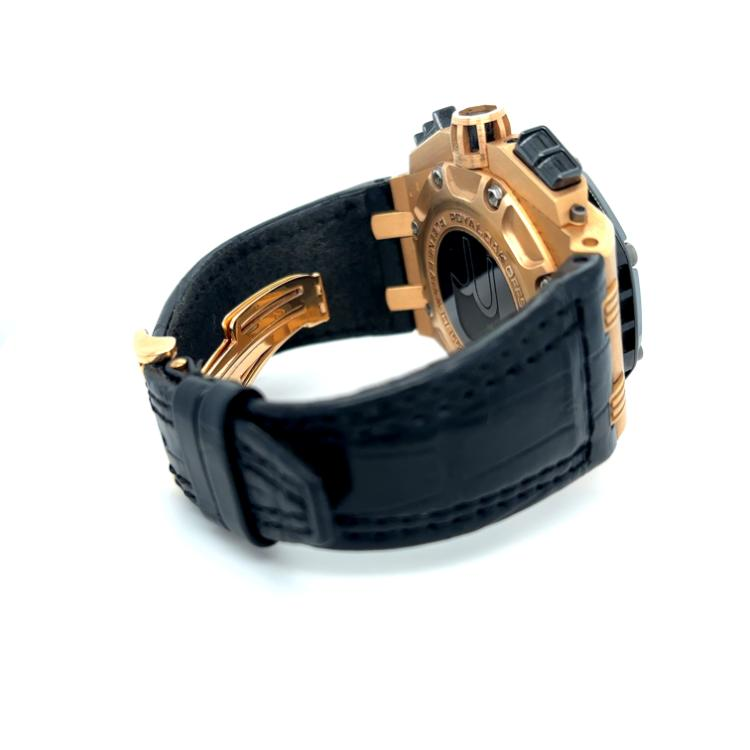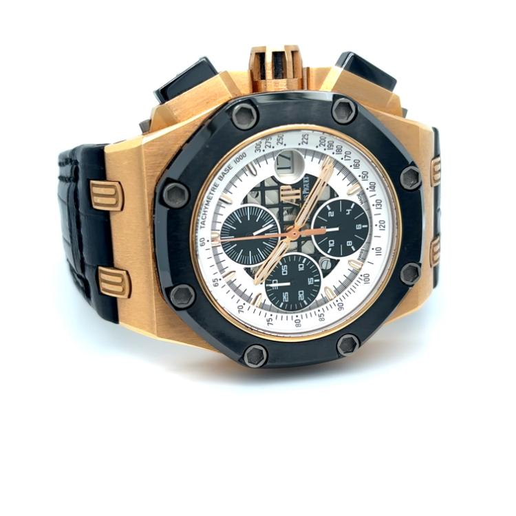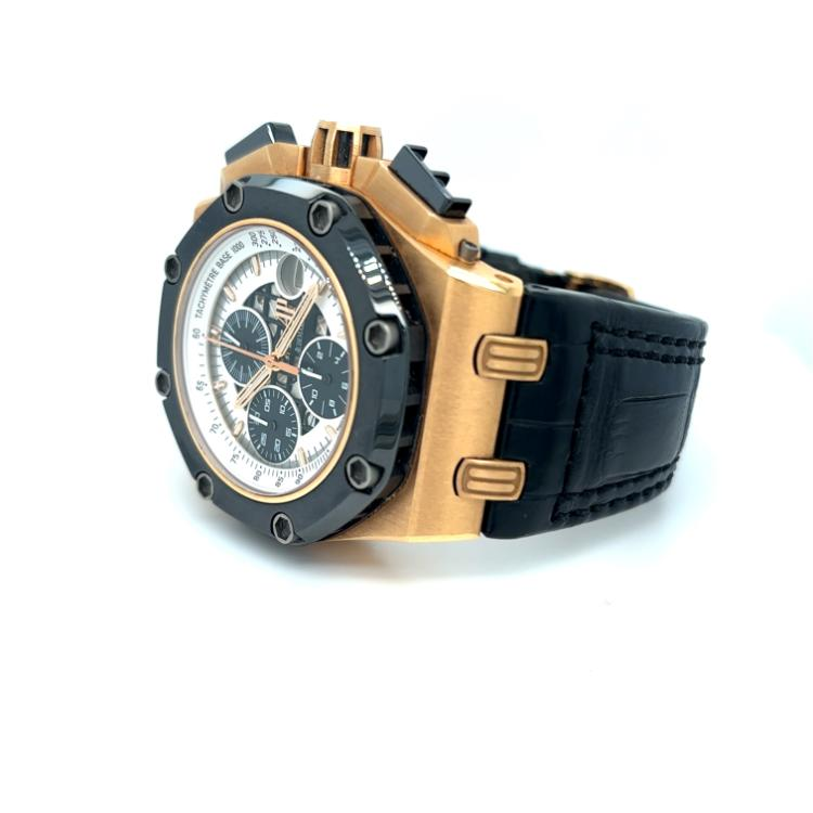 Audemars Piguet Royal Oak Offshore Rubens Barrichello limited editon uitgevoerd in een rosegouden kast met zwarte ceramische lunette voorzien van een witte deels opengewerkte wijzerplaat met zwarte subdials en een zwarte alligator lederen band met rosegouden vouwsluiting.