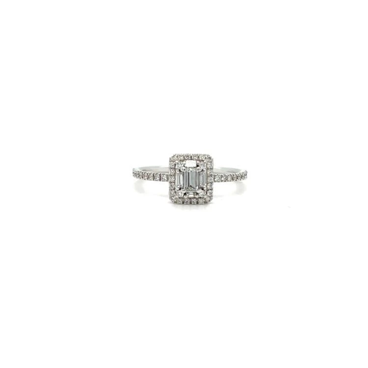 Alberti witgouden entouragering waarin het midden gezet 5x baguette geslepen diamanten met daaromheen en in de band van de ring briljant geslepen diamanten met een totaalgewicht van 0.23crt G-VS.