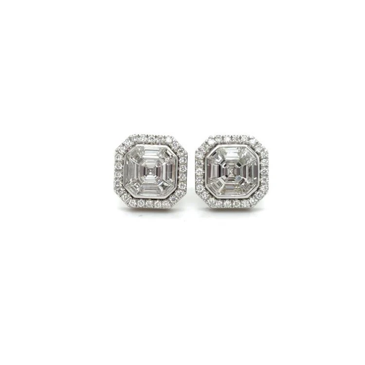 Artur Scholl witgouden oorstekers bestaande uit een illusion zetting bestaande 9x fantasie geslepen diamanten gezet in cushion vorm met een totaalgewicht van 1.54crt G-VS, met daaromheen briljant geslepen diamanten met een totaalgewicht van 0.41crt G-VS.
