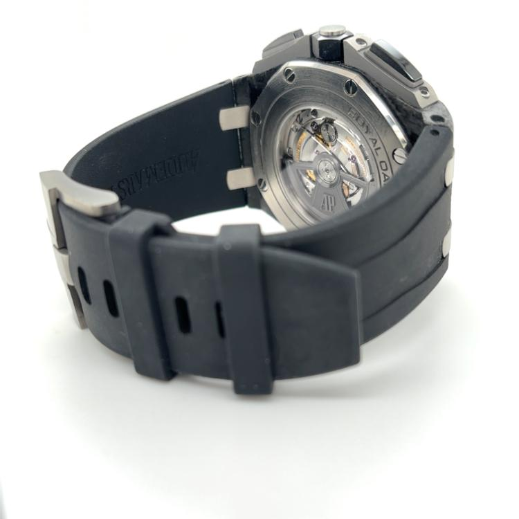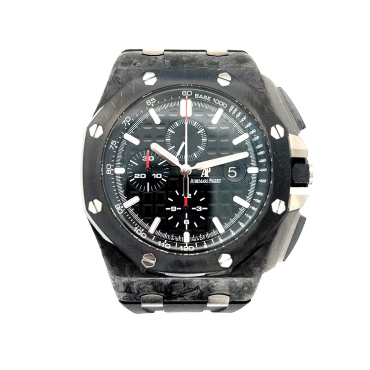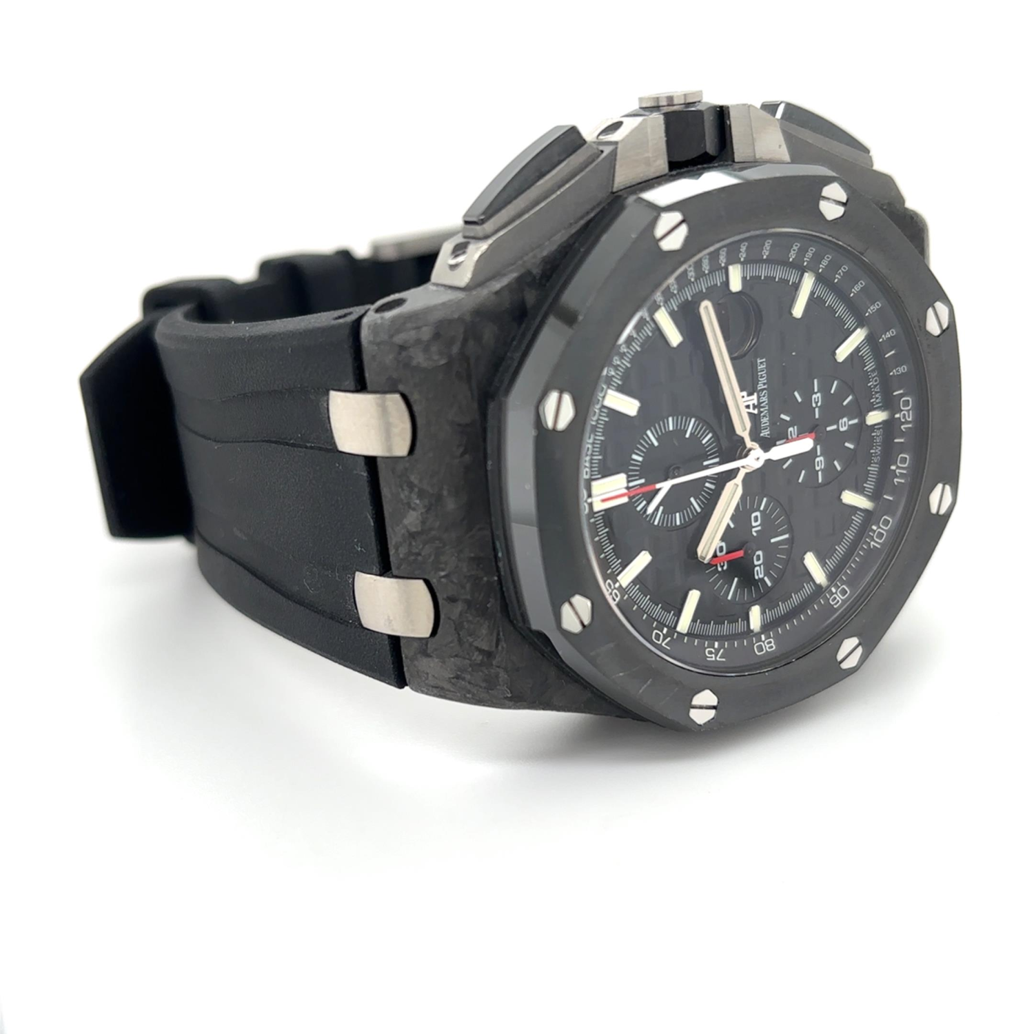 Audemars Piguet Royal Oak offshore uitgevoerd in een 44mm carbon kast met zwarte keramische lunette, zwarte wijzerplaat met chronograaf functie en een automatisch uurwerk voorzien van een zwarte rubberen band en stalen gesp.