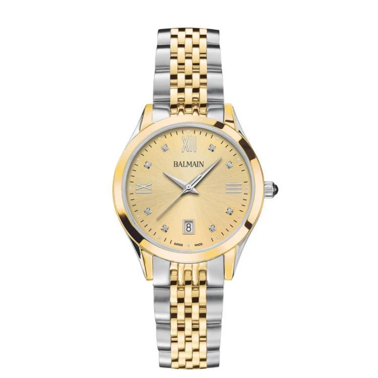 Balmain Classic R horloge. Uitgevoerd met een 34mm bicolor kast. Voorzien van een goudkleurige wijzerplaat, diamanten index en bicolor band. Het horloge heeft een quartz uurwerk en een waterdichtheid van 50m.