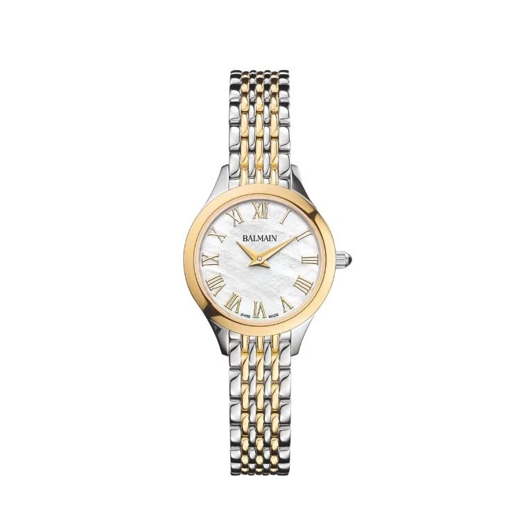 Balmain de Balmain horloge. Uitgevoerd met een 25mm staal geelgouden pvd kast. Voorzien van een parelmoer wijzerplaat en romijnse cijfers. Het horloge heeft een quartz uurwerk en een waterdichtheid van 50m.