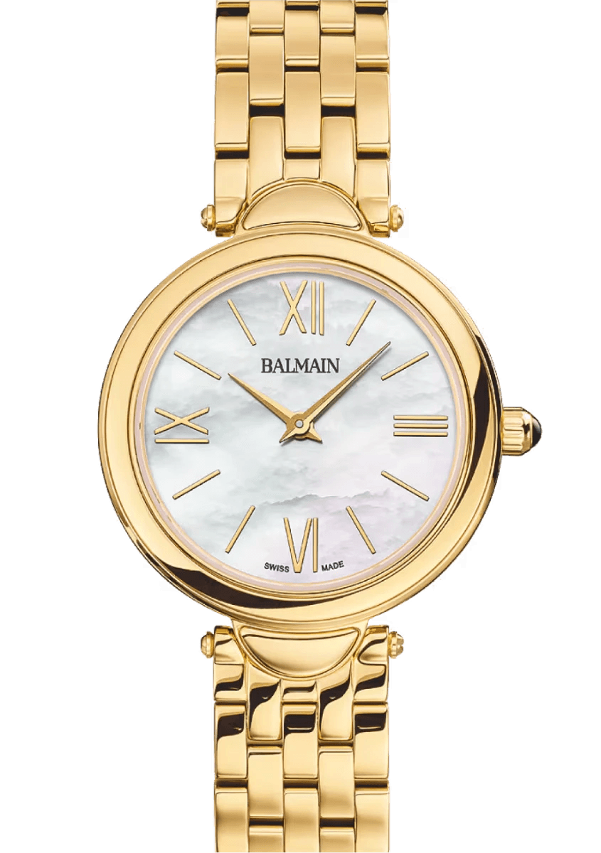 > Balmain Haute Elegance horloge. Uitgevoerd met een 29mm geelgouden pvd kast. Voorzien van een parelmoer wijzerplaat en streepindex. Het horloge heeft een quartz uurwerk en een waterdichtheid van 50m.