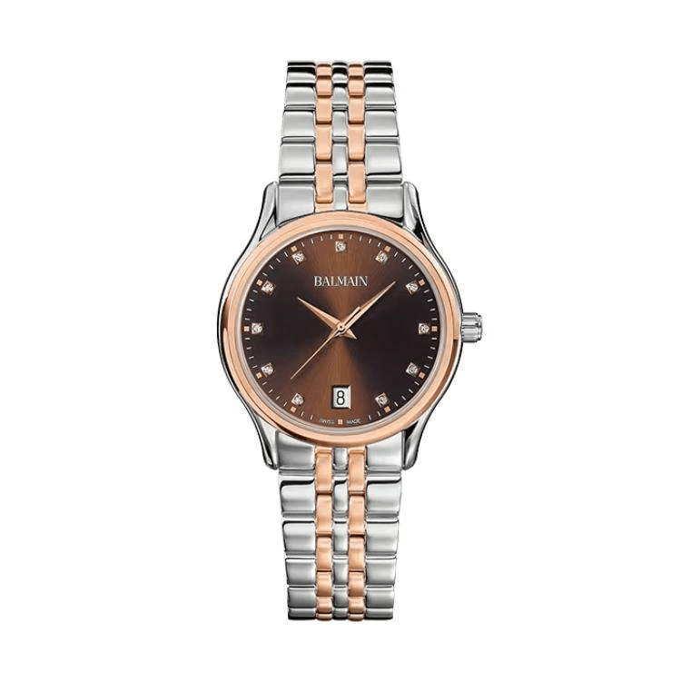 Balmain Beleganza horloge. Uitgevoerd met een 27.5mm bicolor kast. Voorzien van een bruine wijzerplaat met diamanten index en bicolor band. Het horloge heeft een quartz uurwerk en een waterdichtheid van 50m.