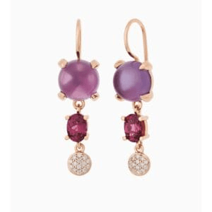 > Bron Catch oorhangers. Uitgevoerd in 18krt rosegoud voorzien van een cabochon geslepen amethyst, met daaronder ovaal geslepen rhodoliet, wit briljant geslepen diamant van totaalgewicht 020ct.
