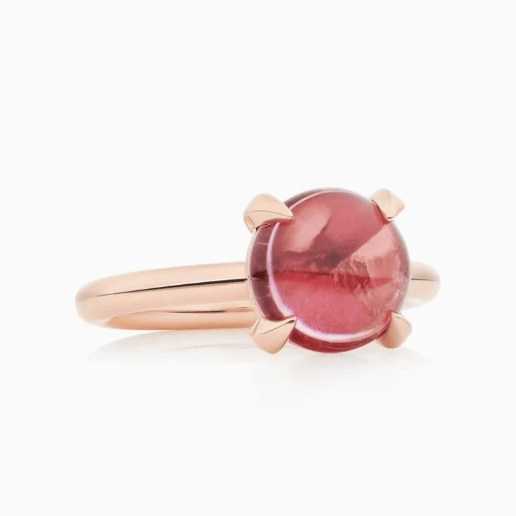 Bron Catch damesring. Uitgevoerd in 18krt rosegoud voorzien van een 10mm cabochon geslepen roze toermalijn.