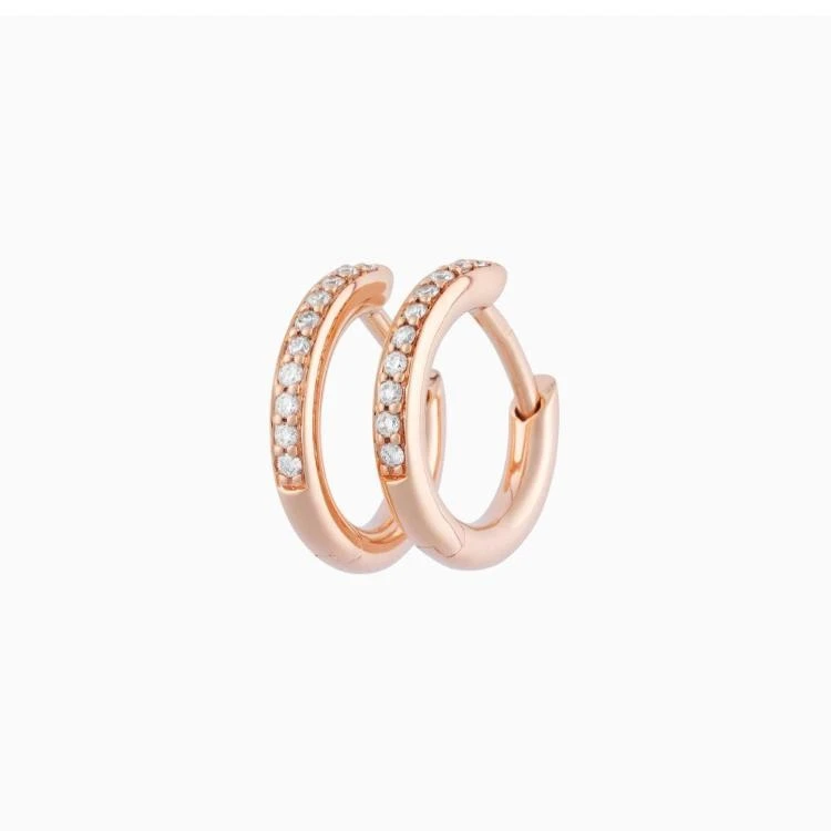 Bron Lux oorringen. Uitgevoerd in 18krt rosegoud. De oorringen hebben een diameter van 13mm, en zijn bezet met witte briljant geslepen diamanten van totaalgewicht 0.12ct.