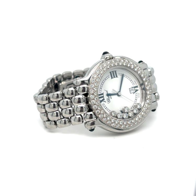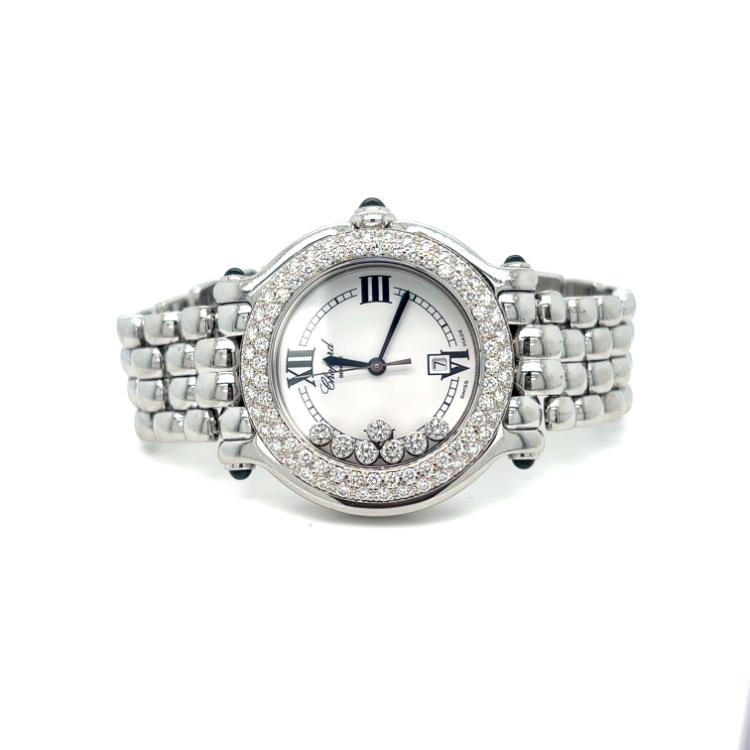 Chopard Happy Sport uitgevoerd in een 32mm stalen kast, witte wijzerplaat met 7 happy diamonds, briljanten lunette en een stalen band.