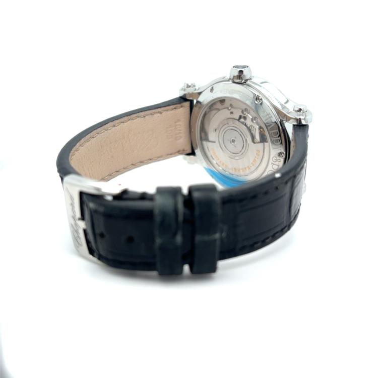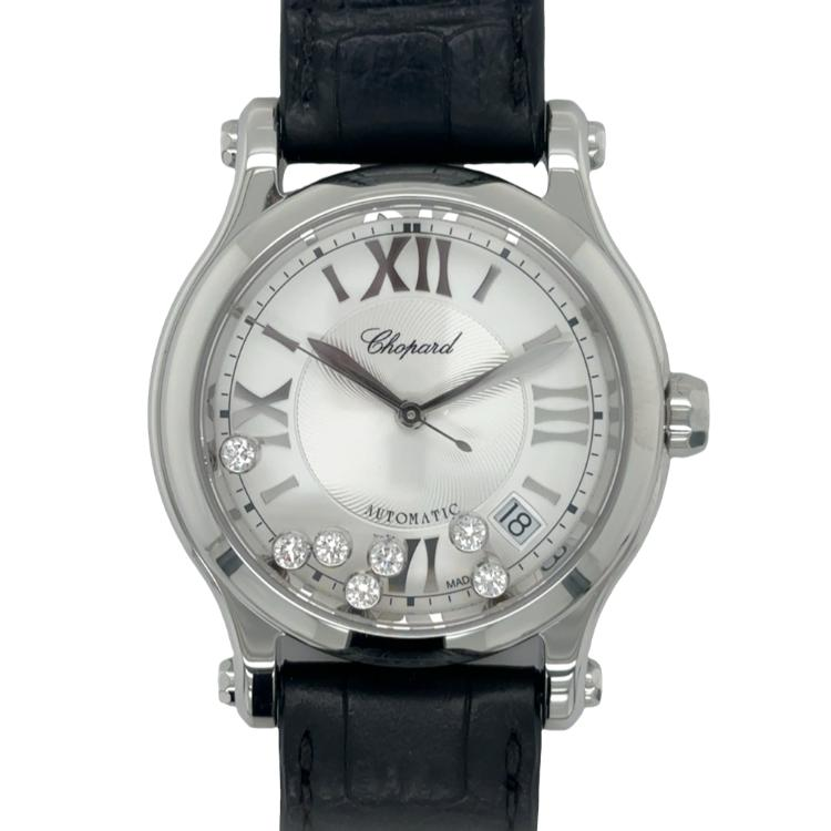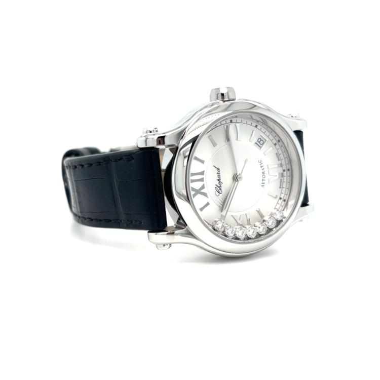 Chopard Happy Sport uitgevoerd in een 36mm stalen kast met een zilveren wijzerplaat voorzien van 7 happy diamonds, datum aanduiding en een automatisch uurwerk met een alligator lederen band en stalen gesp sluiting.