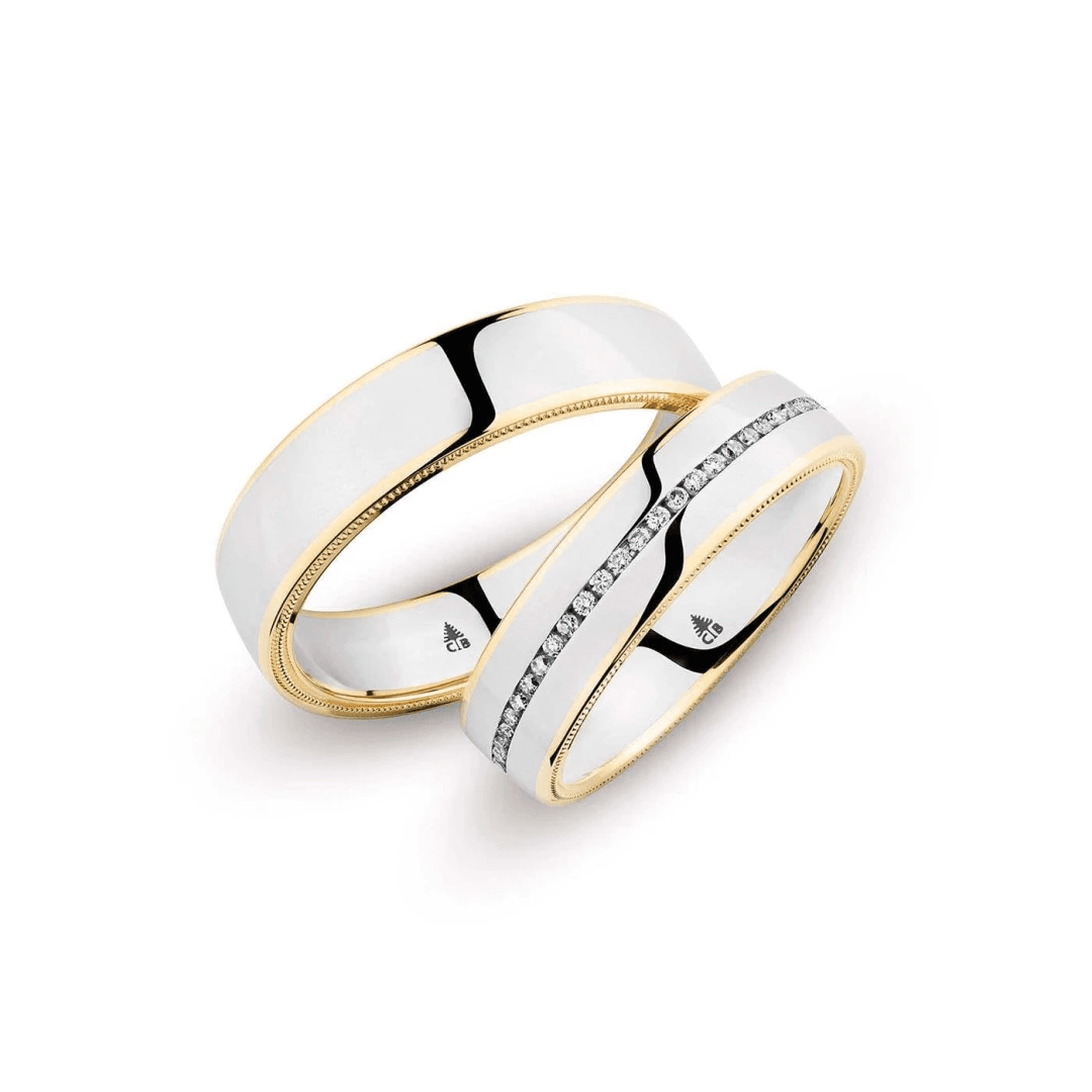 Christian Bauer trouwringen. Uitgevoerd in 14 krt wit en rosegoud. De (dames)ring is bezet met briljant geslepen diamanten van totaalgewicht 0.23ct.