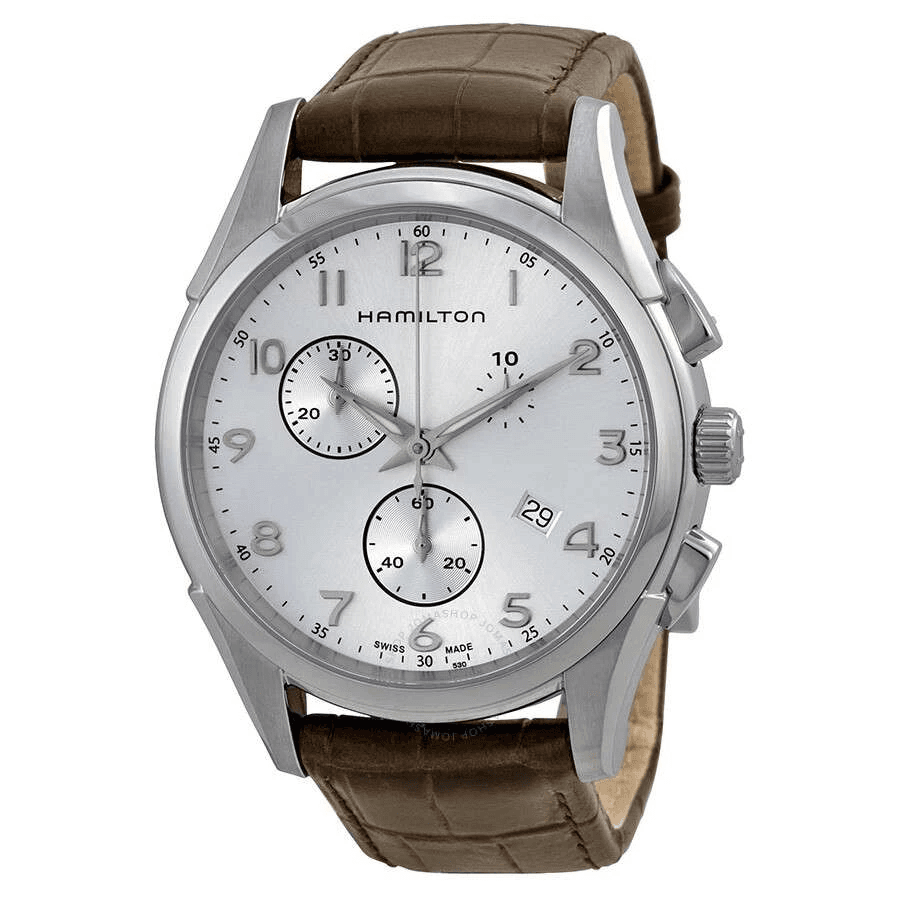Hamilton Jazzmaster Thinline Chrono Quartz. Uitgevoerd met een 43mm stalen kast voorzien van een zilveren wijzerplaat en een kalfsleren band met alligator print en gespsluiting. Het horloge heeft een quartz uurwerk met een waterdichtheid van 50m.