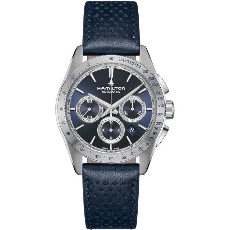Hamilton Jazzmaster performer auto chrono. Uitgevoerd met een 42mm stalen kast voorzien van een blauwe wijzerplaat en een leder band met vouwsluiting. Het horloge heeft een automatisch uurwerk caliber H-31 met een gangreserve van 60 uur en een waterdichtheid van 100m.