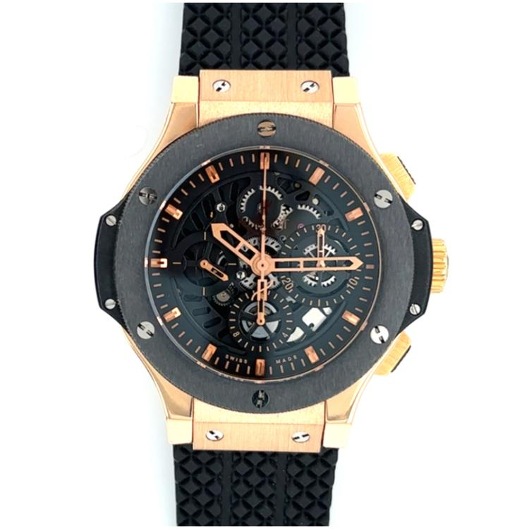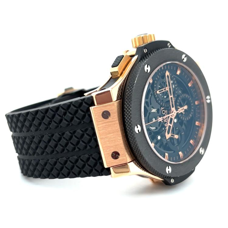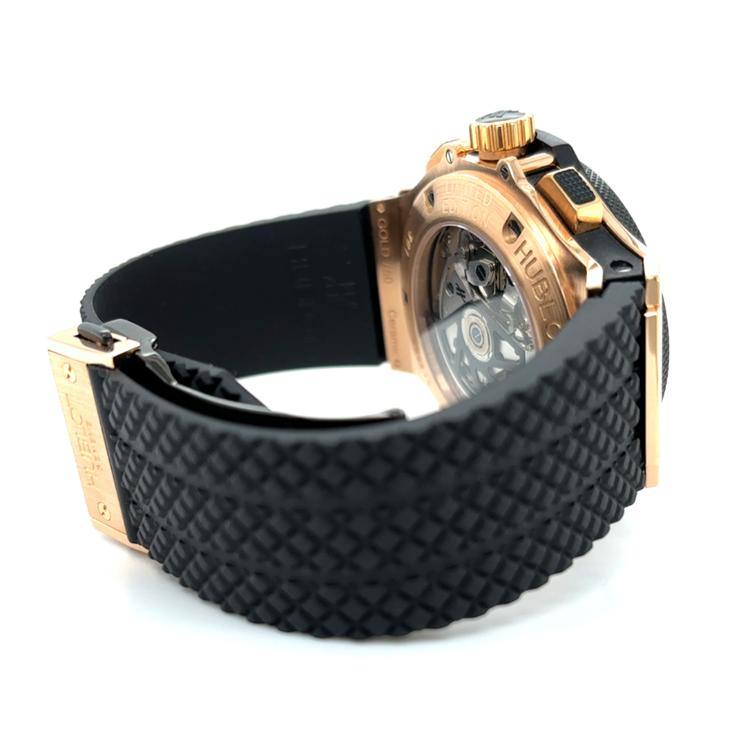 Hublot Big Bang herenhorloge uitgevoerd in een 44mm rosegouden kast gecombineerd met een zwart PVD middenkast en lunette, zwarte rubberen band en rosegouden vouwsluiting. voorzien van een skeleton wijzerplaat en een automatisch uurwerk.