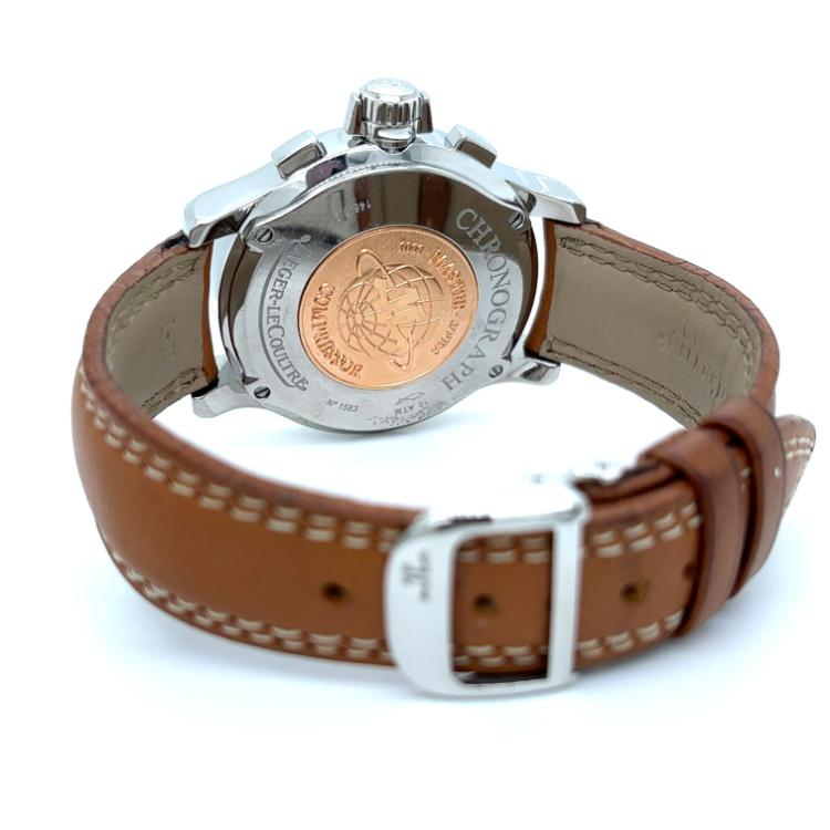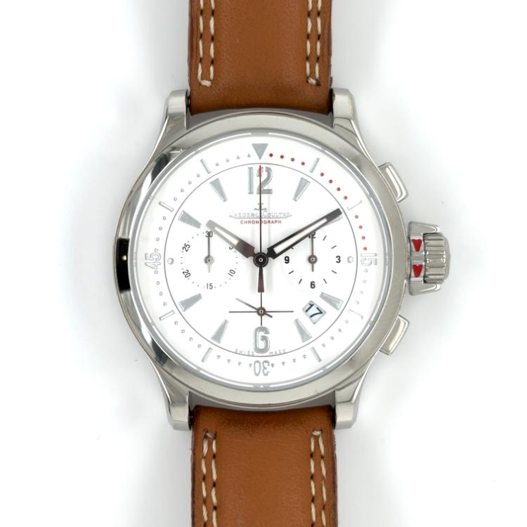 Jaeger Le-Coultre Master Compressor chronograph horloge uitgevoerd met een 37mm stalen kast, witte wijzerplaat en camelkleurige lederen band met stalen vouwsluiting. Het horloge is voorzien van een automatisch uurwerk.