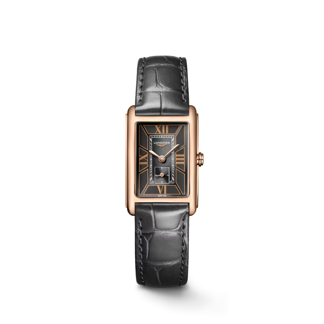 Longines DolceVita horloge. Uitgevoerd met een rechthoekige 20.5x32mm 18 krt rosegouden kast voorzien van een zwarte wijzerplaat en een alligator leder band met rosegouden gesp. Het horloge heeft een quartz uurwerk en een waterdichtheid van 30m.