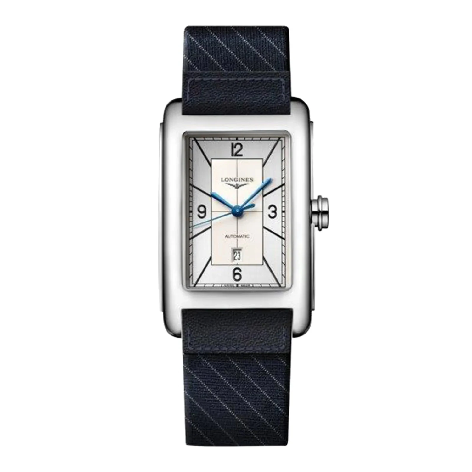 Longines DolceVita horloge. Uitgevoerd met een rechthoekige 27.7 x 43.8mm stalen kast voorzien van een zilveren wijzerplaat en een kunstvezel leder band met gesp. Het horloge heeft een automatisch uurwerk en een waterdichtheid van 30m.