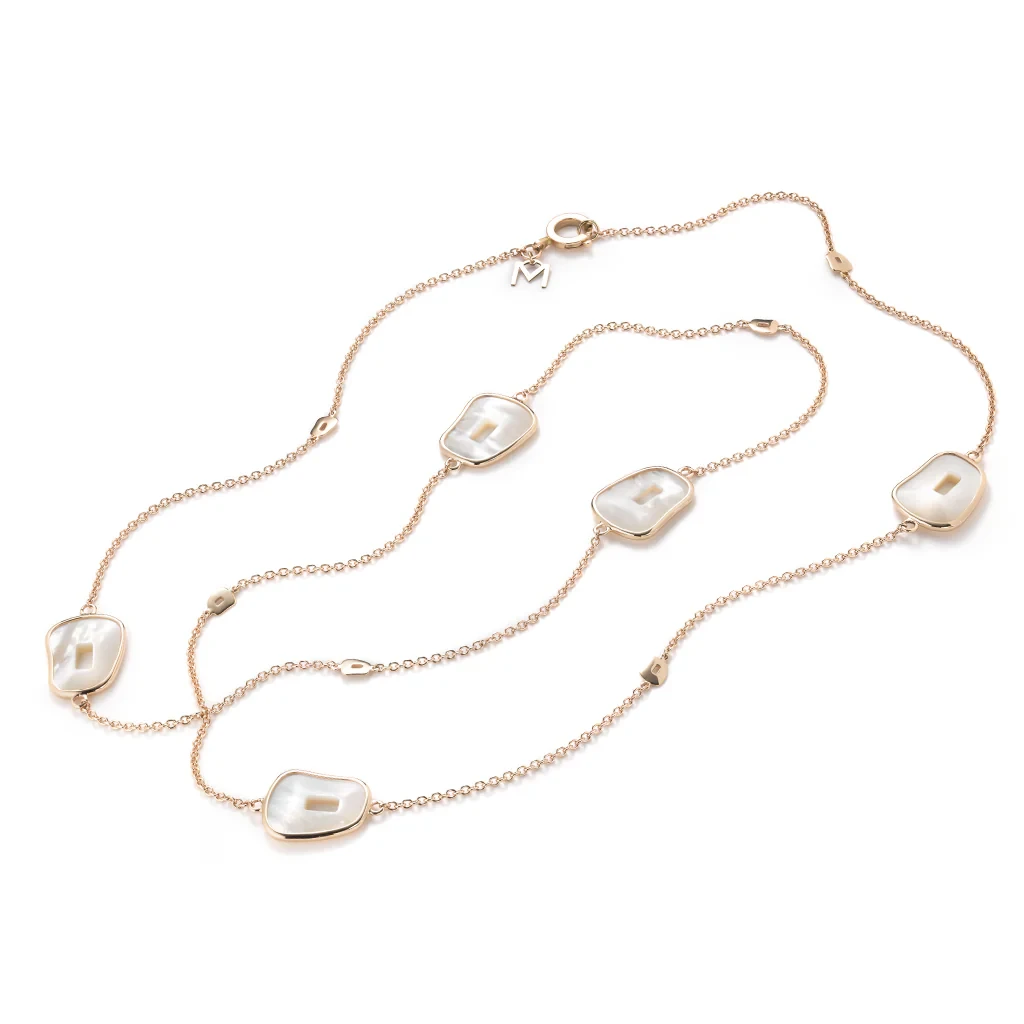 Mattioli Puzzle Sautoir collier. Uitgevoerd in 18krt rosegoud, bezet met witte parelmoer. Het collier is 90cm lang.