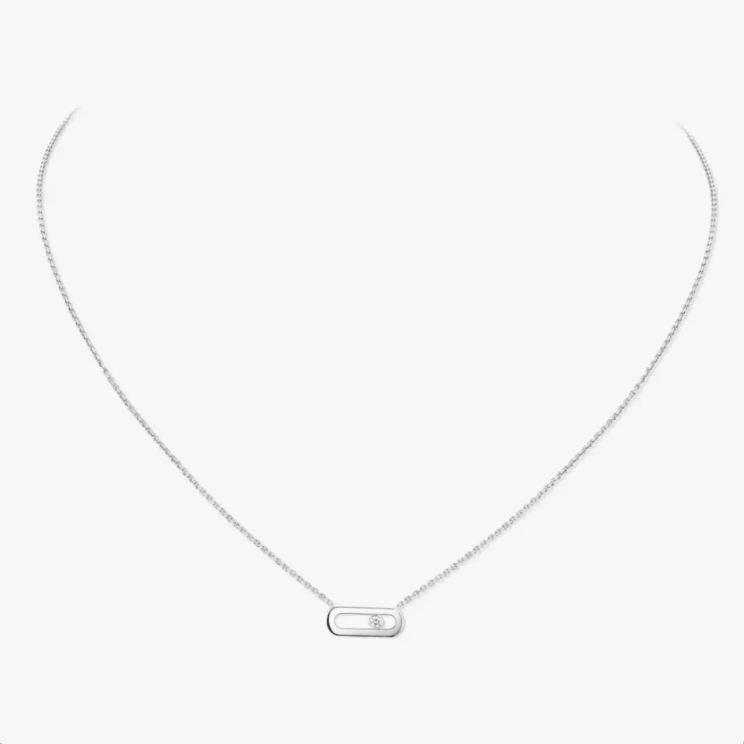 Messika Gold Move Uno Pave necklace. Uitgevoerd in 18krt witgoud voorzien van een langwerpige hanger met een "move" diamant en in het collier voorzien van enkele briljant geslepen diamanten met een totaalgewicht van 0,10crt. Kleur G, zuiverheid VS. Het collier heeft een lengte van 45cm en is in lengte verstelbaar.