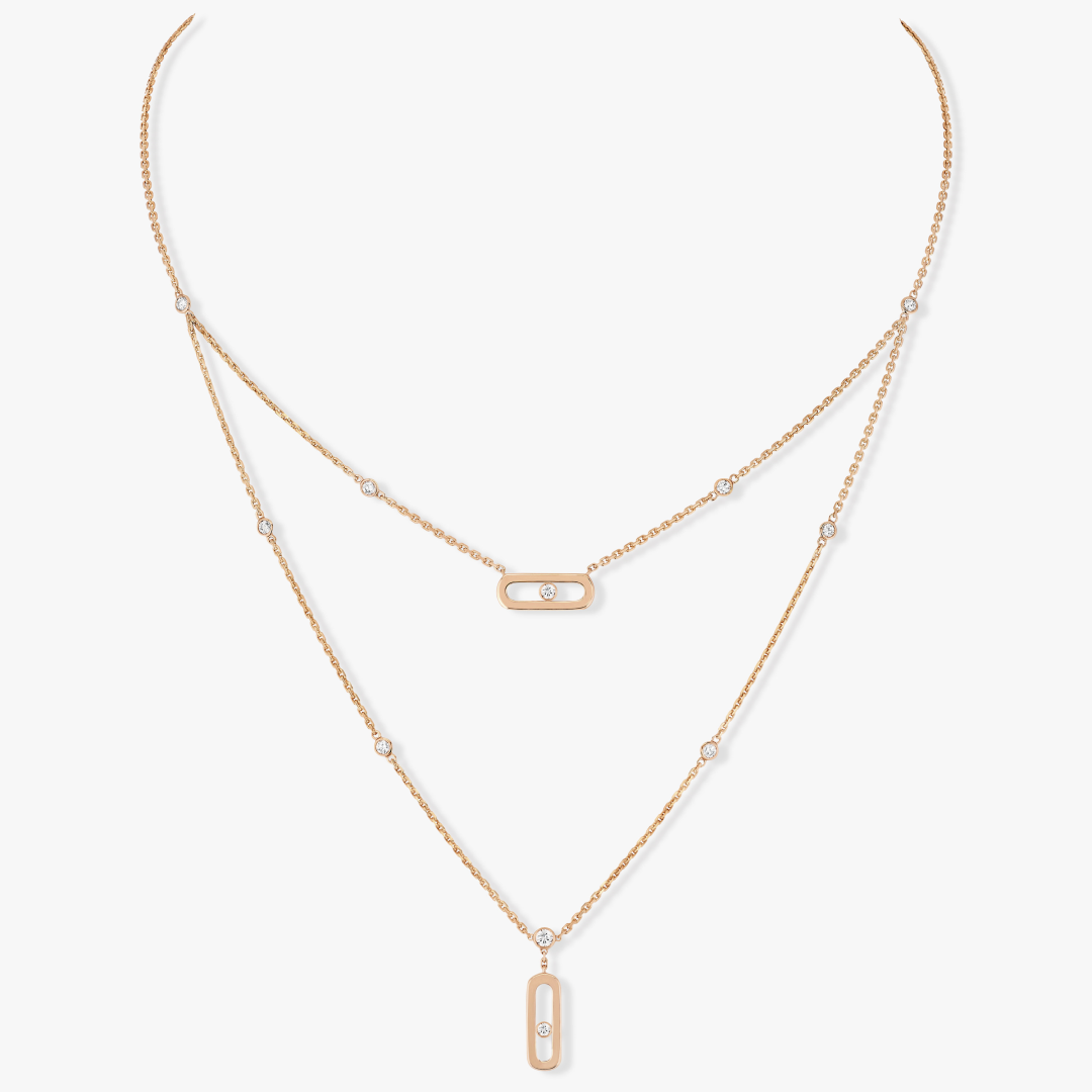 Move Uno 2 Row collier uit de serie Move Uno. Uitgevoerd in 18krt rosegoud voorzien van 2 langwerpige hangers met een "move" diamant, met een totaalgewicht van 0,20crt. Kleur G, zuiverheid VS. Het collier heeft een lengte van 45cm en is in lengte verstelbaar.