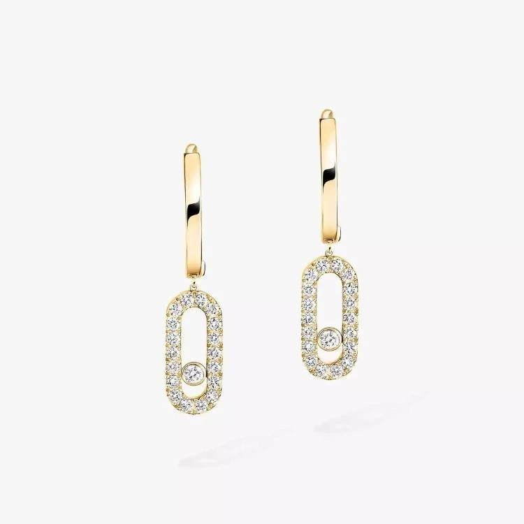 Messika Move Uno Hoop Oorringen. Uitgevoerd in 18krt geelgoud voorzien van een ovale vorm waarin gezet witte briljant geslepen diamanten met in het midden een "move" diamant met een totaalgewicht van 0,19crt.