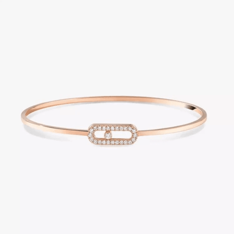 Messika Move Uno Pavé Flex bangle armband. Uitgevoerd in 18krt rosegoud voorzien van een ovale vorm waarin gezet witte briljant geslepen diamanten met in het midden een “move” diamant met een totaalgewicht van 0,18crt.