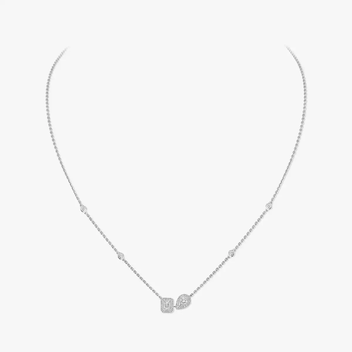 Messika My Twin Toi & Moi collier. Uitgevoerd in 18krt witgoud. Het collier is voorzien van 2 hangers, een baguette en een peer geslepen diamant en daaromheen witte briljant geslepen diamanten met een totaalgewicht van 0,30crt. Het collier heeft een lengte van 45cm.