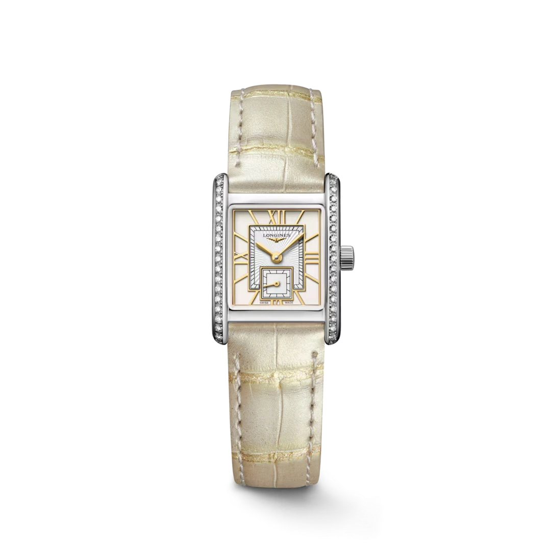 Longines Mini DolceVita horloge. Uitgevoerd met een 21.5x29mm stalen kast met diamanten,voorzien van een ivory wijzerplaat en een alligator leder band met gesp. Het horloge heeft een quartz uurwerk en een waterdichtheid van 30m.