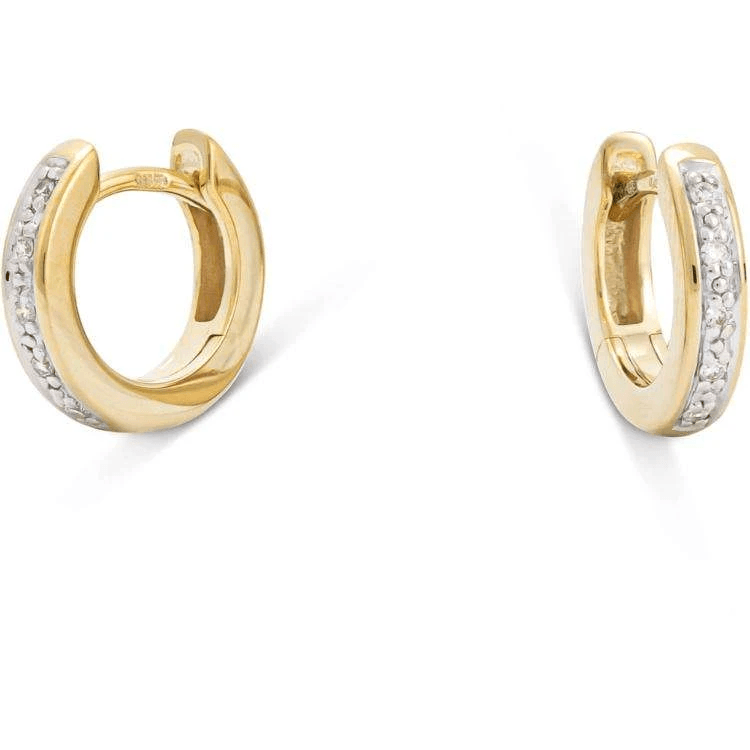 Monzario oorringen. Uitgevoerd in 14krt geelgoud. De oorringen hebben een diameter van 11.8mm en een breedte van 2.6mm en zijn bezet met briljant geslepen diamant van totaalgewicht 0.065crt.