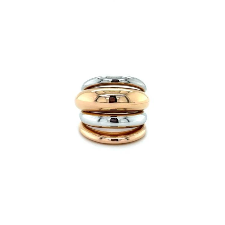 Monzario damesring. Uitgevoerd in 18krt geel- en witgoud bestaande uit een brede ring voorzien van afwisselende banen rose en witgoud.
