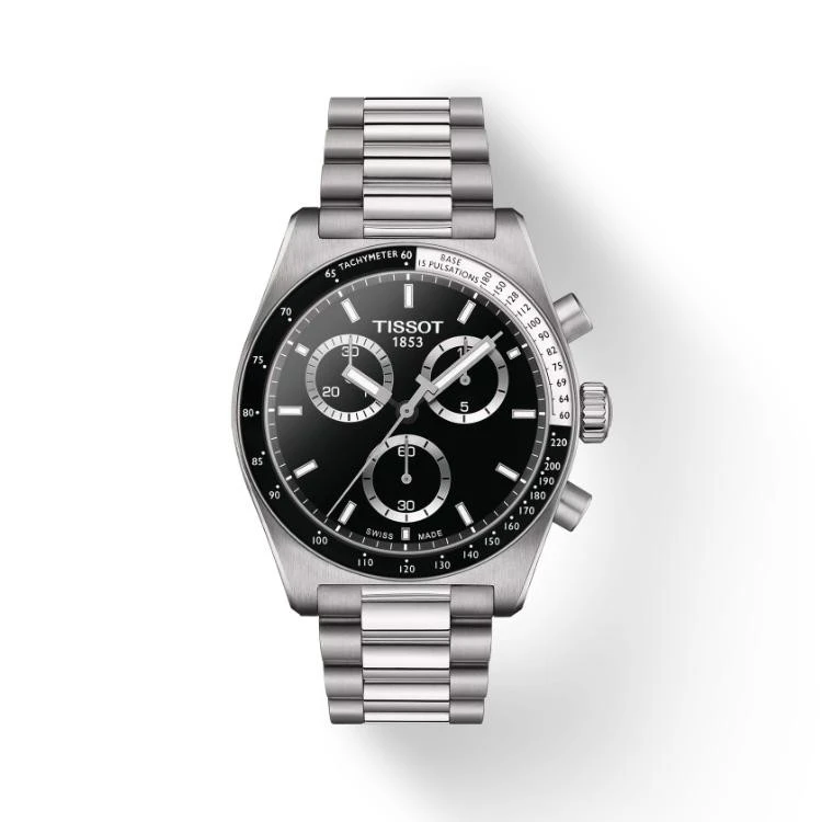 Tissot PR516 chrono horloge. Uitgevoerd met een 40mm stalen kast, voorzien van een zwarte wijzerplaat en een stalen band. Het horloge heeft een quartz uurwerk en een waterdichtheid van 100m.