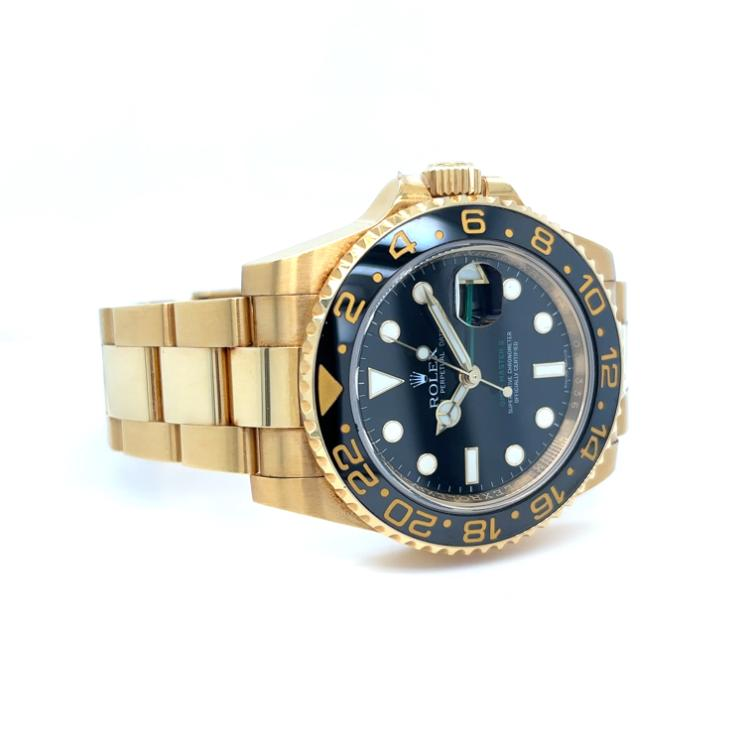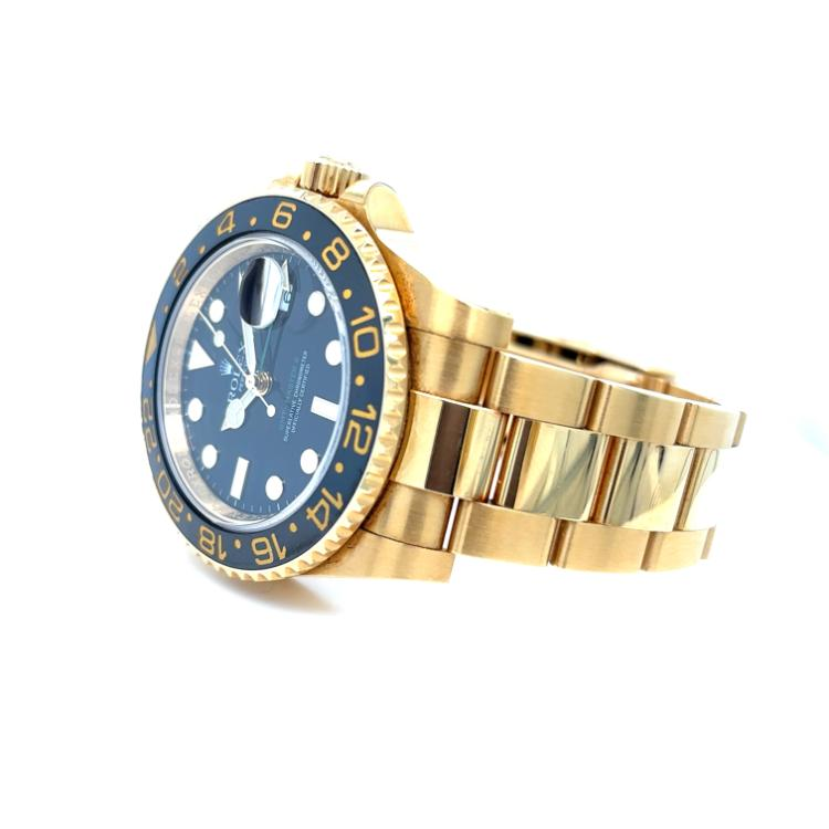Rolex GMT-Master II uitgevoerd in een 40mm geelgouden kast met zwarte wijzerplaat en zwarte ceramische lunette en geelgouden band.