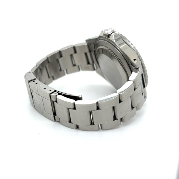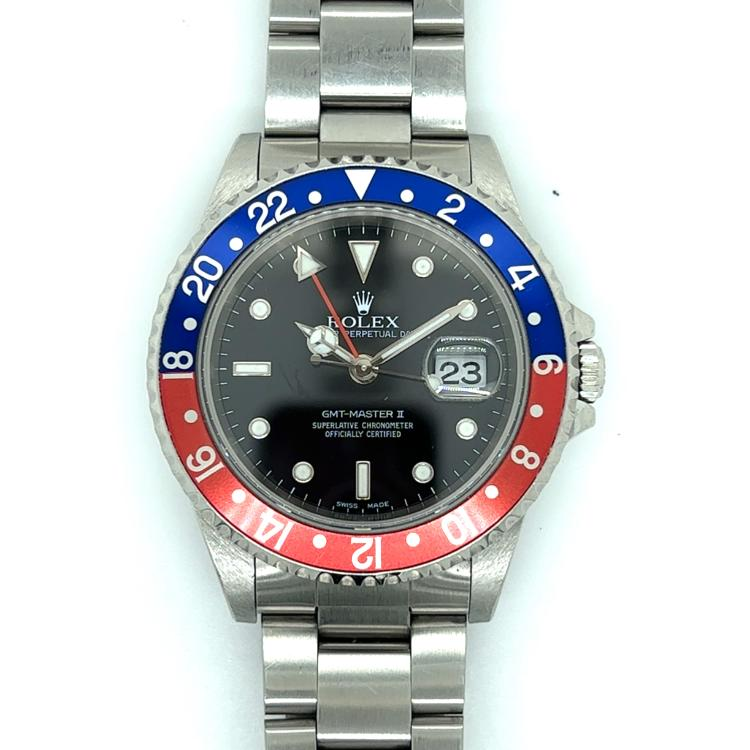 Rolex GMT-Master herenhorloge utigevoerd in een 40mm stalen kast met een zwarte wijzerplaat en een rood/blauwe aluminium lunette voorzien van een stalen oysterband en een automatisch uurwerk.