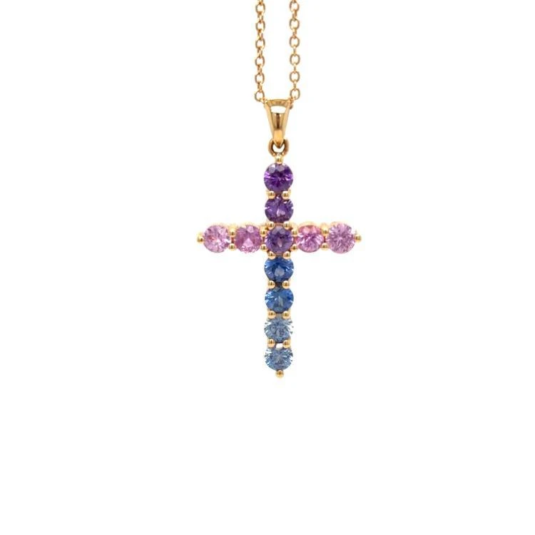 Alberti rosegouden collier met kruis hanger waarin gezet 11 briljant geslepen saffieren in mix van de kleuren paars, blauw en roze.