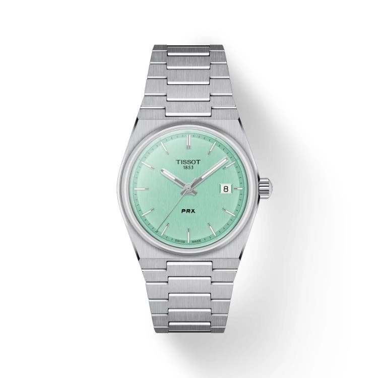 Tissot PRX horloge. Uitgevoerd met een 35mm stalen kast, voorzien van een licht groene wijzerplaat en een stalen band. Het horloge heeft een quartz uurwerk, en een waterdichtheid van 100m.