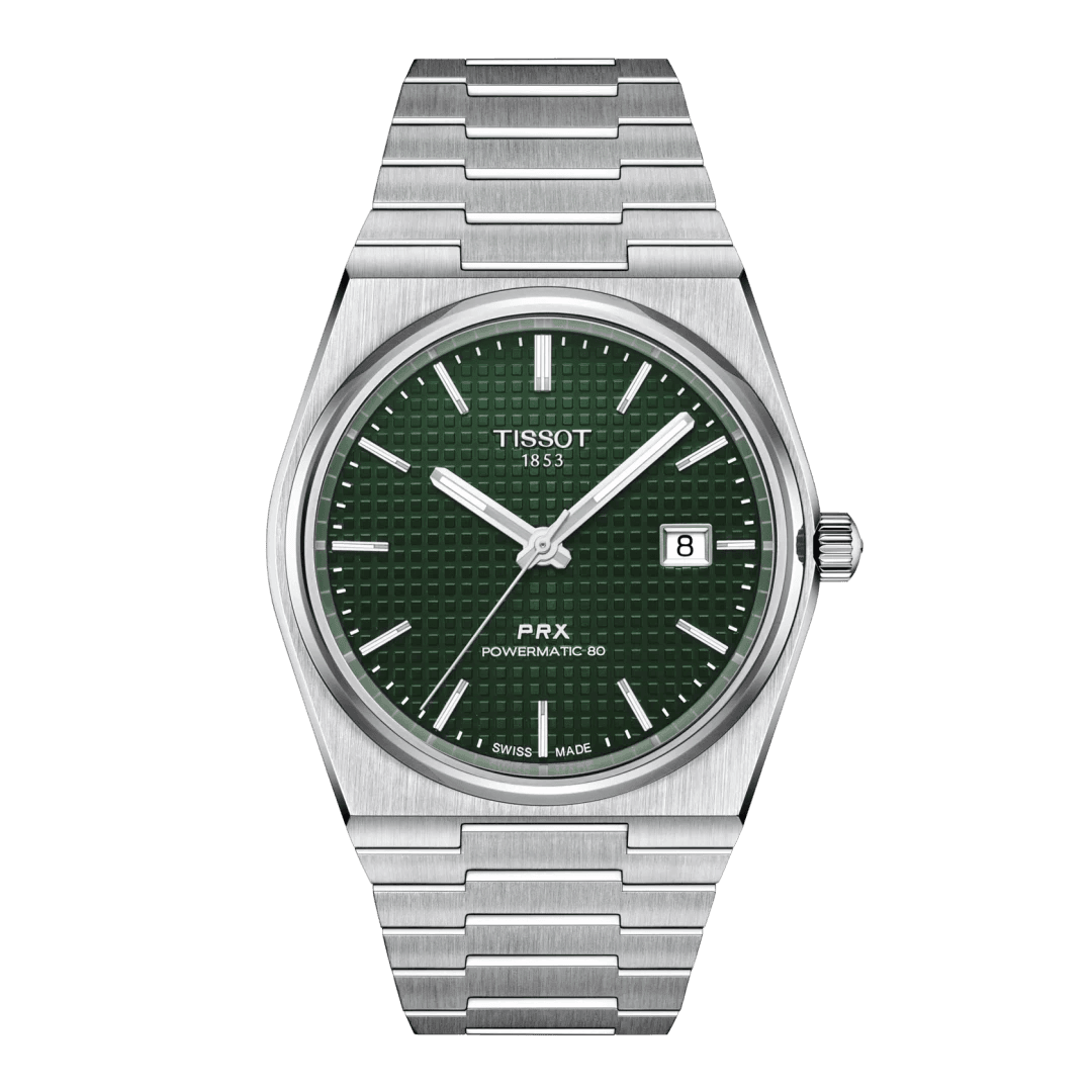 Tissot PRX horloge. Uitgevoerd met een 40mm stalen kast, voorzien van een groene wijzerplaat en een stalen band. Het horloge heeft een automatisch uurwerk met een gangreserve van 80 uur en een waterdichtheid van 100m.