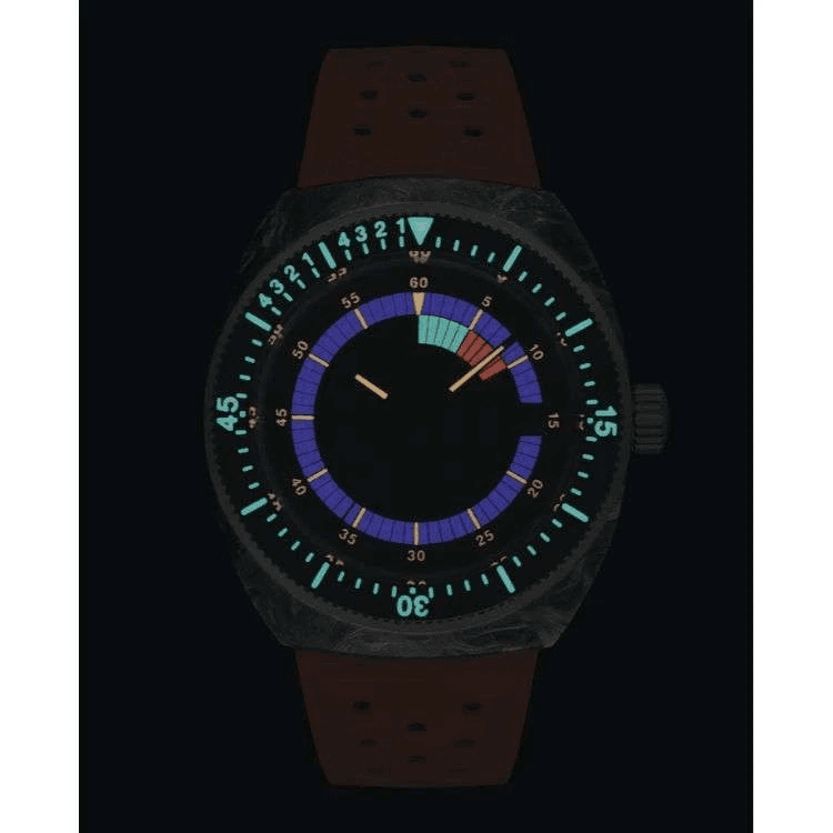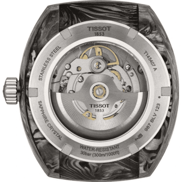 Tissot Sideral S Powermatic 80 horloge. Uitgevoerd met een 41mm stalen kast met zwart en grijs gemarmerd gesmeed carbon, voorzien van een zwarte wijzerplaat en een rubberen band. Het horloge heeft een automatisch uurwerk, caliber Powermatic 80 met een gangreserve tot 80 uur, en een waterdichtheid van 300m.