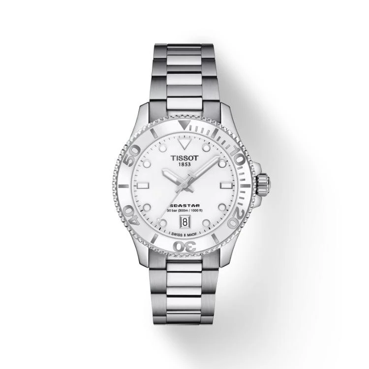 Tissot Seastar horloge. Uitgevoerd met een 36mm stalen kast, voorzien van een witte wijzerplaat en een stalen band. Het horloge heeft een quartz uurwerk, en een waterdichtheid van 300m.