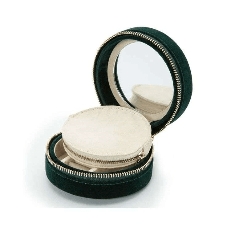 Juwelen reis etui van het merk WOLF1834. Uitgevoerd in groen fluweel voorzien van opberg mogelijkheden voor al uw sieraden.